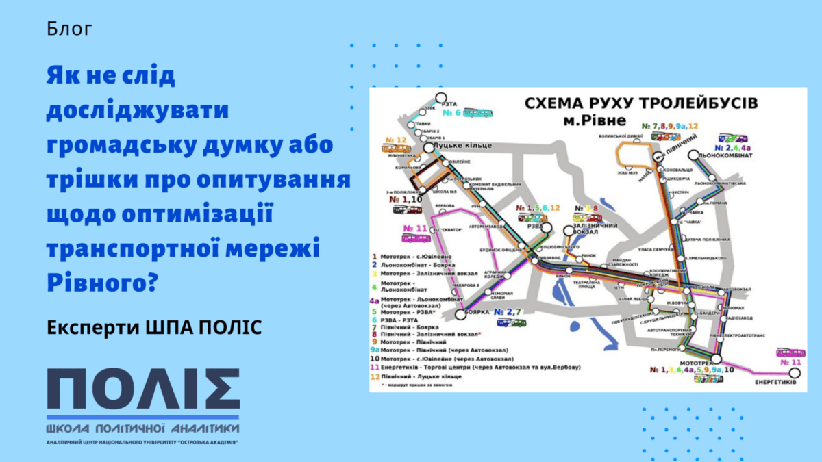 У твердженні «Неперсоналізовану інформацію буде використано для статистичного аналізу, складання карти поїздок і оптимізації транспортної мережі м. Рівне та Квасилів.» є низка проблем. По-перше, розробники опитування не до кінця розуміють що м. Рівне та смт. Квасилів це Рівненська міська територіальна громада, оскільки в преамбулі в основному згадується м. Рівне. По-друге, за допомогою опитування можна оцінити якість послуг, виявити сильні чи слабкі сторони, але точно не складання карти поїздок і оптимізації транспортної мережі громади. Якщо розробники та організатори опитування за бюджетні кошти дійсно прагнуть зрозуміти проблеми транспортного сполучення в Рівненській міській територіальній громаді, то для початку варто ознайомитися із подібними аналітичними матеріалами, які реалізовувались в Україні.