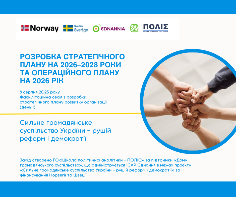 8 серпня 2025 року громадська організація «Школа політичної аналітики – ПОЛІС» провела фасилітаційну стратегічну сесію в рамках реалізації Проєкту «Розробка стратегічного плану на 2026–2028 роки та операційного плану на 2026 рік», який отримав підтримку за результатами участі в конкурсі «Грантовий конкурс з організаційного розвитку 2025–2027».
